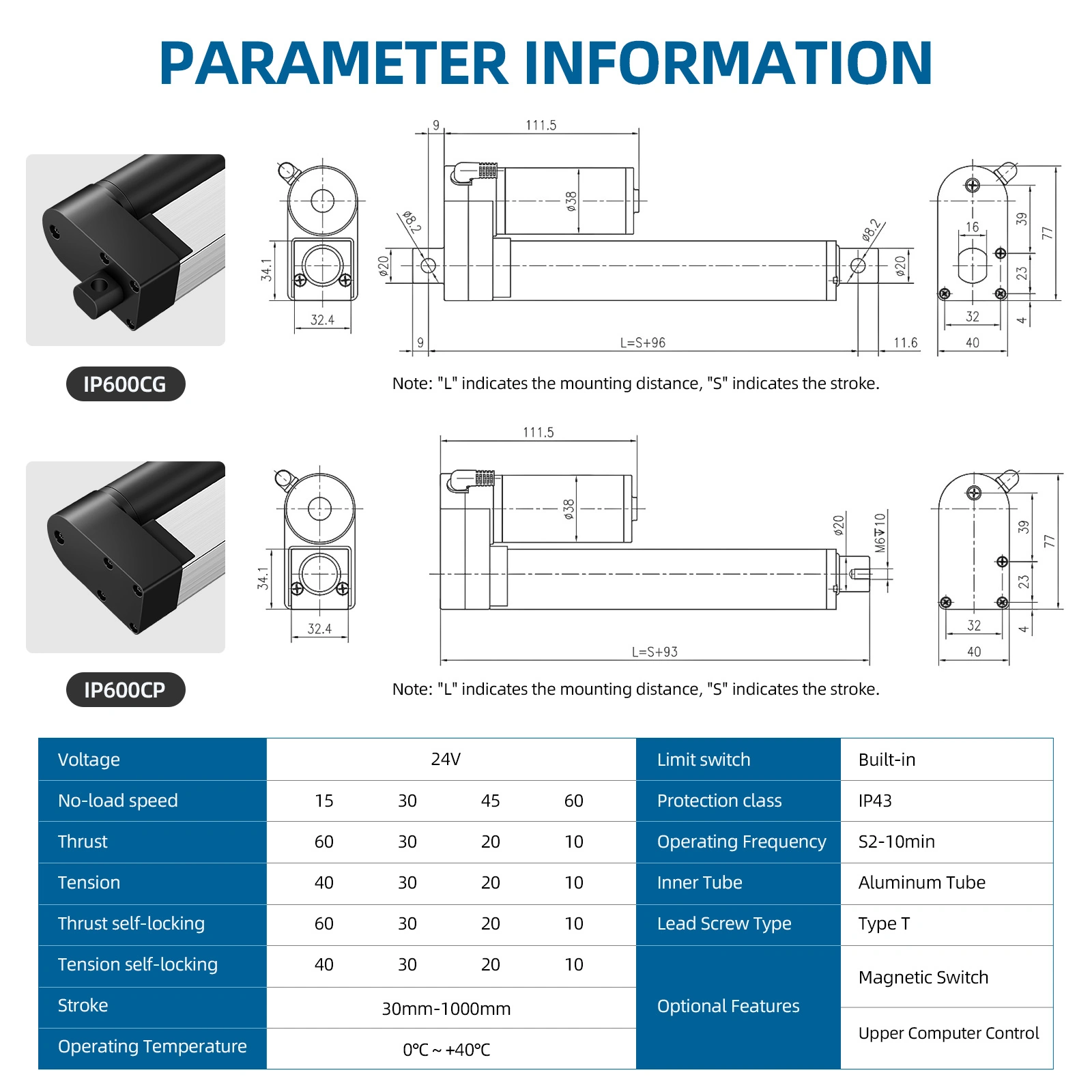 Этот IP600 является высокопроизводительным 24V линейным актуатором разработан для требовательных здравоохранения и медицины и промышленных условий. Обладая прочной подъемной способностью 6000 Н и защитой IP66, он обеспечивает надежную точность в солнечном трекинге и настройках медицинских кроватей.